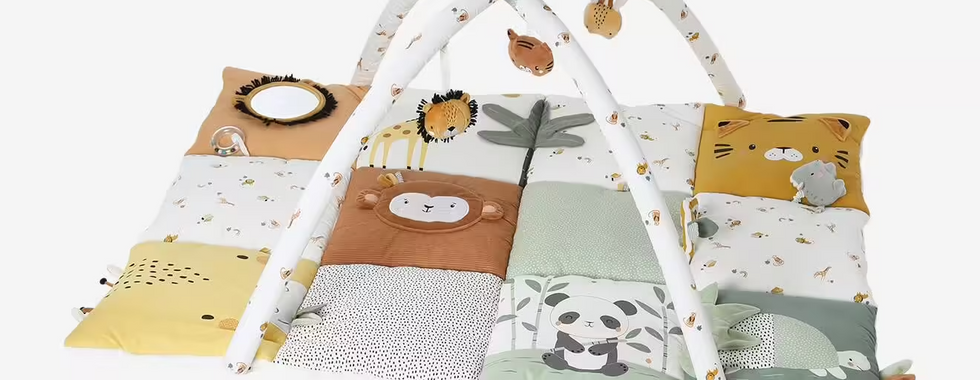 Conseil : Pensez aux tapis d’éveil et aux jeux sensoriels, toujours bien reçus par les jeunes enfants.
